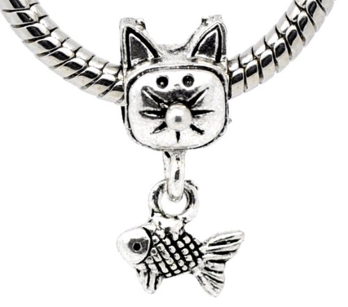 Believe Beads © 1 X Cat with Dangle Fish Charm Bead fits Pandora/Troll/Chamilia style Bracelets