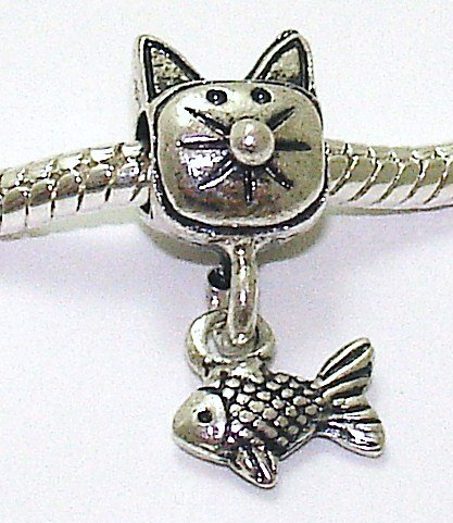 Cat & Fish Dangle - Silver Plated Charm Bead - fits Pandora, Chamilia etc style Bracelets - SpangleBead
