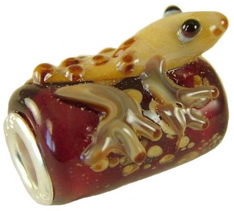 LAMPWORK GLASS GEKKO ON A RED BASE SLIDE ON CHARMFULLY COMPATIBLE WITH PANDORA TROLL COMPONENTSSIZE 20mm IN LENGHT X 12mm IN DIA APPERTURE 4.50mm