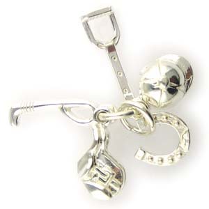 Fine craftsman made Sterling Silver charm made in the UK. Equestrian 5 piece horse riding charm including hat, crop, stirrup saddle and horse shoe. Free extra silver split ring with every charm for easy home fitting. These are the same type and size as supplied with Links of London charms and bracelets. Supplied in box and velveteen pouch. Also suitable as a pendant. Suppllied as one five piece charm, but the individual charms can be used for a small bracelet with the addition of split rings. For relative sizes the crop is 12mm length, the hat is 7mm