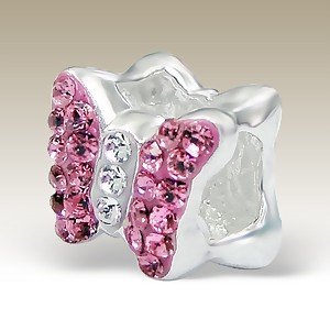 Believe Beads © 1 x Solid Sterling Silver Stamped 925 Butterfly with Pink and Clear Crystal Stones, Slide On slide Off Charm Bead. Will fit pandora, Troll Chamilia style charm bracelets. Height 9.0mm. Width 10.3mm. Type - Silver Beads Material - 925 sterling silver Approx. Weight - 2.1 G Finishing - Sterling silver+Epoxy Cover Description - Butterfly bead with crystal stones