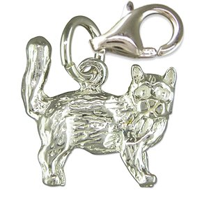 A cute long-haired cat charm in Sterling silver. The charm is 3-dimentional and solid, measures 2.5 cm in length and weighs approximately 2.99 grams (both measurements include the clasp).