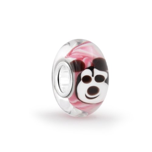 Think pink with this super adorable mouse like mickey bead. This Murano glass bead is a one of a kind animal bead as it boasts a mouse like Mickey face on the pink and white swirl Murano glass bead. For all those Mouse lovers enjoy this Mickey Mouse inspired bead. A Pandora compatible bead, accompany this with other animal beads and bead compatible with Pandora. Accent this Mickey Mouse inspired bead with a duck bead, dog bead and gal pal mouse bead. Build an animal beads Pandora compatible bracelet today. Bead Core 5mm.